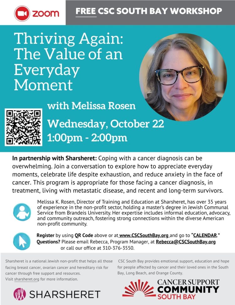 Cancer Support Community South bay partnership with Sharsheret: Coping with a cancer diagnosis can be overwhelming. Join a conversation to explore how to appreciate everyday moments, celebrate life despite exhaustion, and reduce anxiety in the face of cancer. This program is appropriate for those facing a cancer diagnosis, in treatment, living with metastatic disease, and recent and long-term survivors.