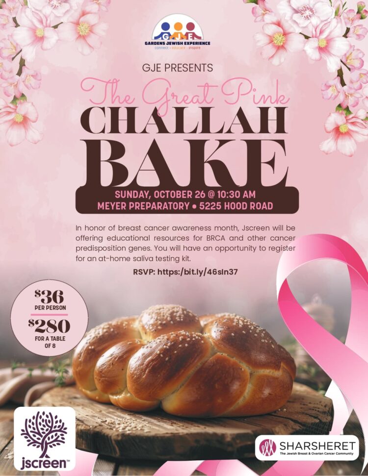 Join Gardens Jewish Experience & Sharsheret for the annual Great Pink Challah Bake – a meaningful and inspiring event in honor of Breast Cancer Awareness Month.