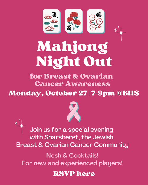 Join Brooklyn Heights Synagogue and Sharsheret for Mahjong Night Out on October 27th at 7:00 pm. The event will feature a Sharsheret speaker and a light nosh and cocktails will be provided. Can’t wait to see you there!