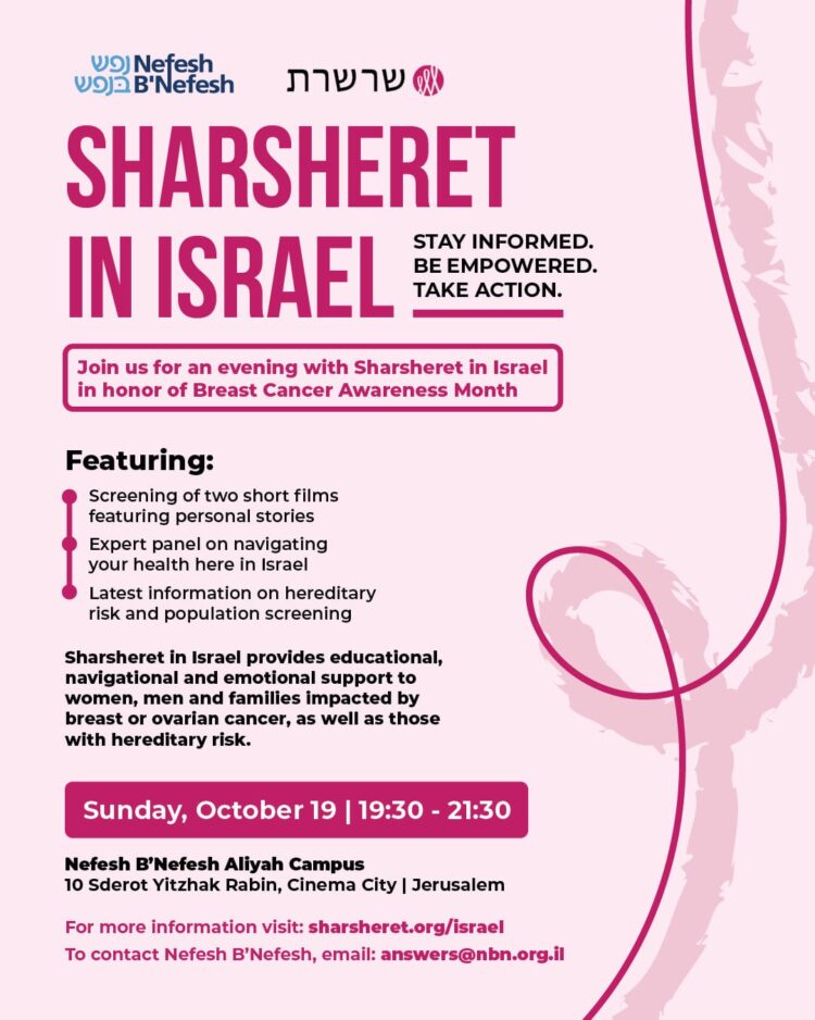 « All Events Sharsheret in Israel October 19 @ 7:30 pm - 11:30 pm IDT « Team Sharsheret at the ACS Making Strides Walk How Do You Wear Your Genes? » Add to calendar Google Calendar iCalendar Outlook 365 Outlook Live Details Date: October 19 Time: 7:30 pm - 11:30 pm IDT Venue Nefesh B’Nefesh Aliyah Campus 10 Sderot Yitzhak Rabin Cinema City, Jerusalem, Israel + Google Map